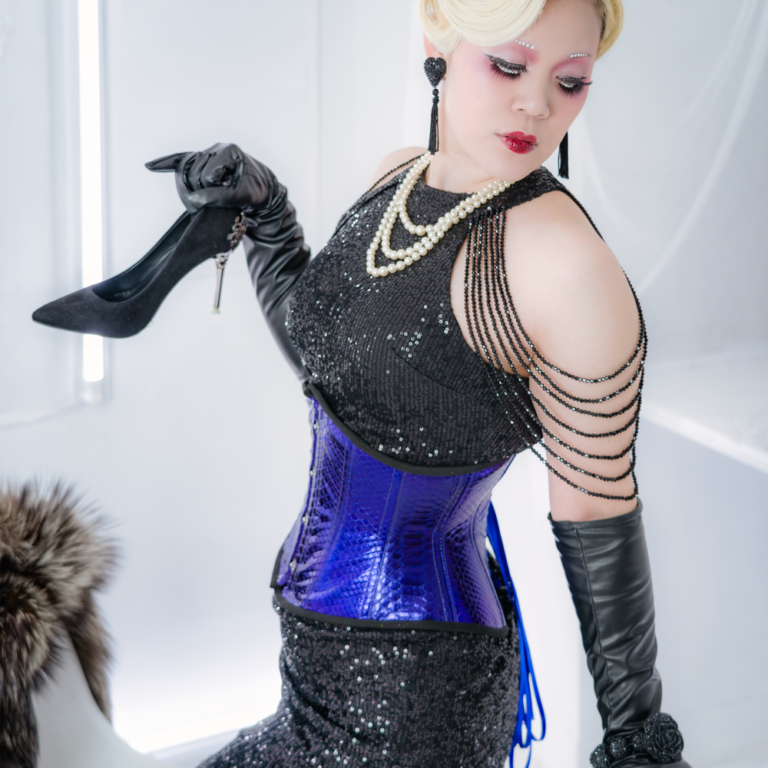 Mist†Mysticオリジナルの砂時計型のレザーコルセット。デザイナーが革の選定から裁断・縫製までこだわったコルセット。